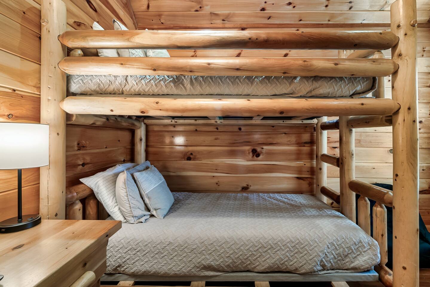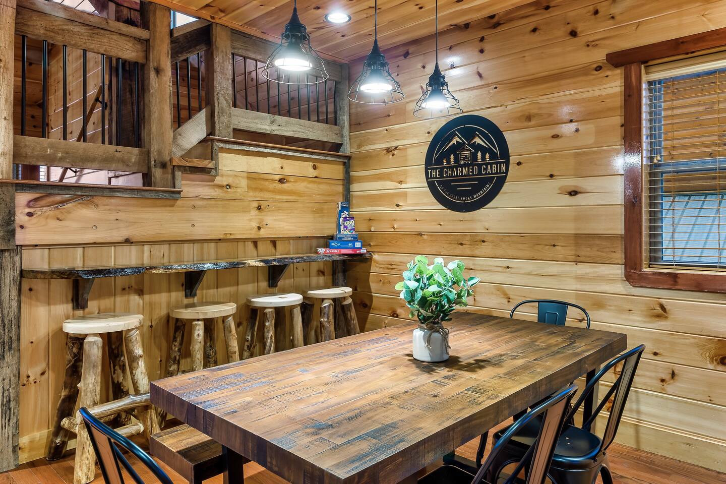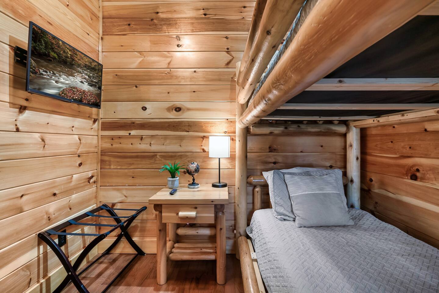 The Charmed Cabin is a cozy 2-story log cabin located in a resort community close to the Smoky Mountains! Comfortably sleeps 6 with a king bed, queen bed, & twin bunks!